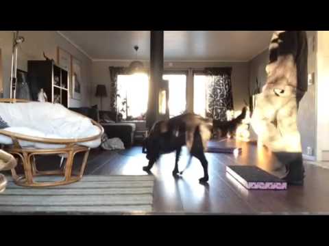 Detta var i går och i morse var jag tvungen att prova ta bort plattformen för att se om hon verkar förstå. Valde att göra det lätt för henne med massor av repetitioner innan (som inte syns på filmen, så kul är det inte att se när hon får äta 100 godisbitar) och sen kasta belöningen bakåt så hon kom in rakt framifrån i rätt position. Man ser att hon ibland blir lite förvirrad och vill komma in vid sidan (kan säga att postion 2 är ännu svårare, då den är himla nära fot) men ganska snart kopplar det.