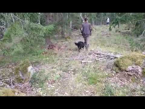 Eftersom Sirap är i slutet av sitt löp fick hon starta sist så jag tänkte att hon skulle sitta i bilen och ladda på ordentligt, men jag tror vi hamnade så långt in i skogen att hon inte förstod riktigt vad som pågick. Det var en lång sträcka till "provplatsen" så jag gjorde lite inkallningar och jobbade ihop oss på vägen. Vi började med en enkel markering utan skott (eftersom det var första gången med skott, så ville jag hon skulle komma in i jobbet först), där tänkte hon knalla.. Men hon var kopplad och sen kunde hon hitta markeringen, vilket hon gjorde jättefint, även fast hon inte hittade den direkt. Lugnt och sansat letade hon på nedfallsplatsen. Bra avlämning.