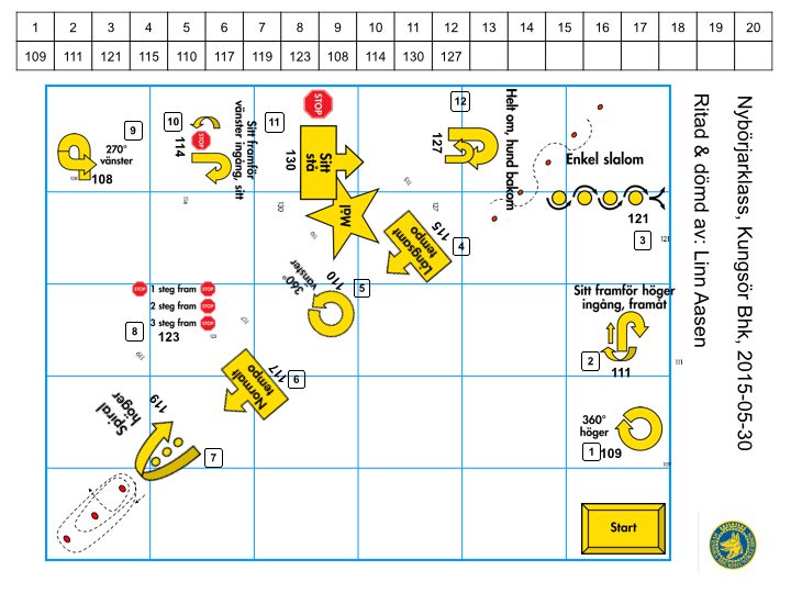 Det var roligt att döma KM, då blev det en möjlighet att omsätta det vi lärt oss de sista gångerna till "skarpt läge". Svårigheten med att döma ett KM låg dock i att det var många som aldrig tävlat tidigare, och utifrån hur det lät på banvandringen så gissar jag att en del inte heller kört rally särskilt mycket. Det var en utmaning :-) Här är banan som de fick gå.